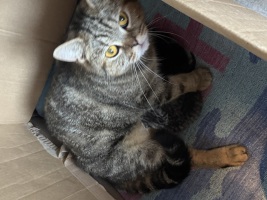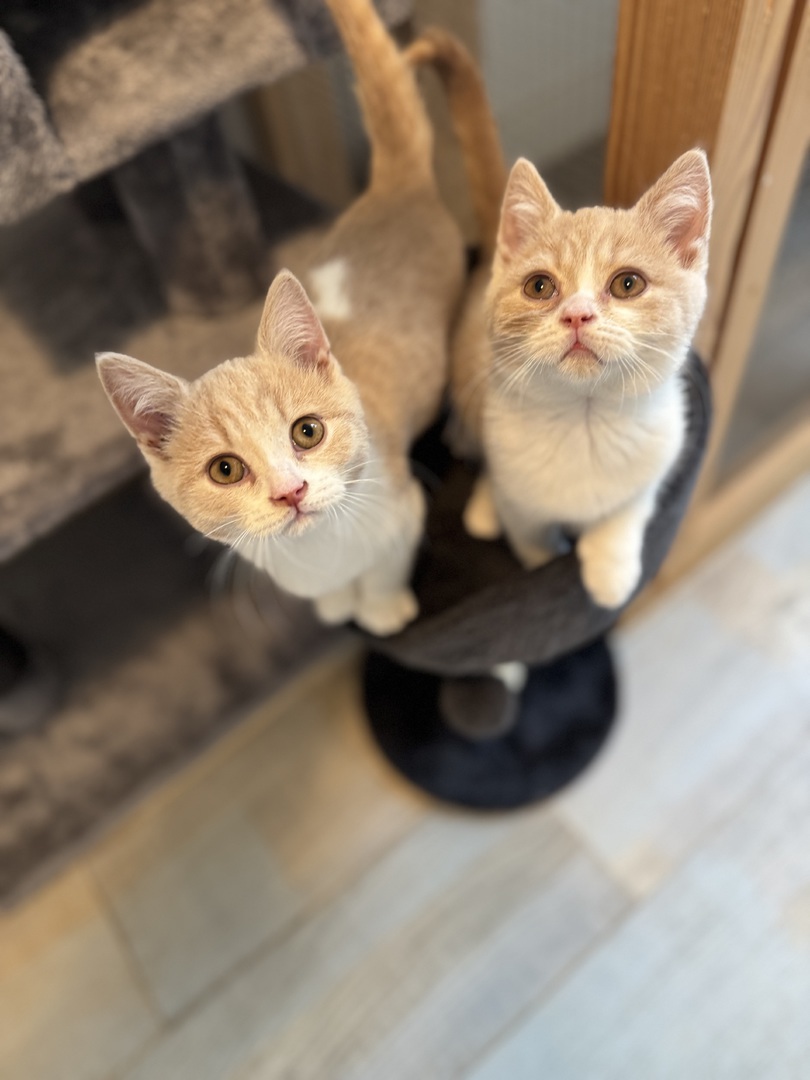 The boys are Penny's kittens born August 2026. They are purr boxes - incredibly loving and sociable and burst into purrs the minute you look their way, but they are not needy and whilst they would love to spend their time near their family, they are happy in each others' company or will make it their mission to bond with any other friendly pets. They have had quite a lot of experience winning over hormonal / pregnant older female cars and making friends with stud boys as well as doing their best to buddy up with my 2 Cavapoos. One adores them but accepts that they are in charge, and if they want to sleep on him, they can...the other one - frustratingly - sees them as prey, and cannot be left alone with them. This is the sole reason they are looking for a home...the boys were destined to be our house cats and have been loved, handled and trained for the role, but very sadly, we cannot train the danger out of Rocky, the dog !!